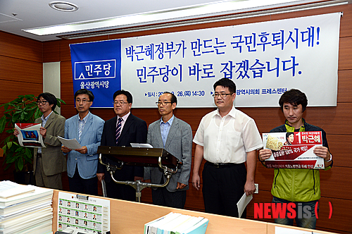 【울산=뉴시스】조현철 기자 = 심규명 민주당 울산시당 위원장 등이 26일 시의회 기자실에서 박근혜정부의 대선공약파기를 성토하는 회견을 열고 있다. 2013.09.26 (사진=울산시당 제공)