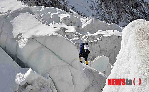 【로체 BC(네팔)=뉴시스】임영주 기자 = “뉴시스 창사 12주년, ‘꿈을 향한 도전’ 2013 히말라야 로체 남벽(8516m) 대한민국 원정대”홍성택 대장이 이끄는 로체남벽원정대가 26일(현지시각) 이틀째 제1 캠프를 구축하기 위해 아이스폴 지역 세락과 크레바스를 통과해 등반 전진하고 있다.