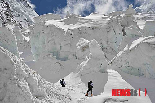 【로체 BC(네팔)=뉴시스】임영주 기자 = “뉴시스 창사 12주년, ‘꿈을 향한 도전’ 2013 히말라야 로체 남벽(8516m) 대한민국 원정대”홍성택 대장이 이끄는 로체남벽원정대가 26일(현지시각) 이틀째 제1 캠프를 구축하기 위해 아이스폴 지역 세락과 크레바스를 통과해 등반 전진하고 있다.
