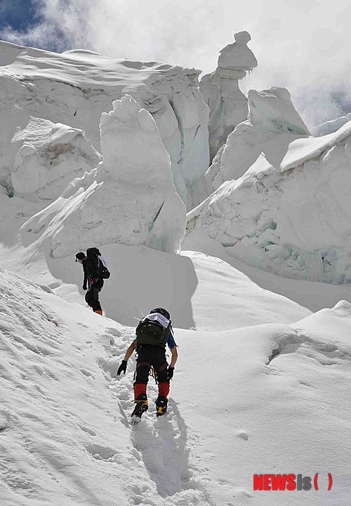 【로체 BC(네팔)=뉴시스】임영주 기자 = “뉴시스 창사 12주년, ‘꿈을 향한 도전’ 2013 히말라야 로체 남벽(8516m) 대한민국 원정대”홍성택 대장이 이끄는 로체남벽원정대가 26일(현지시각) 이틀째 제1 캠프를 구축하기 위해 아이스폴 지역 세락과 크레바스를 통과해 등반 전진하고 있다.