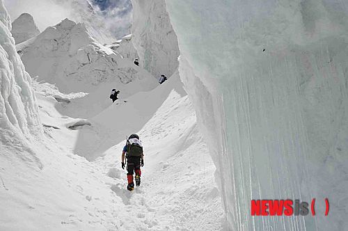 【로체 BC(네팔)=뉴시스】임영주 기자 = “뉴시스 창사 12주년, ‘꿈을 향한 도전’ 2013 히말라야 로체 남벽(8516m) 대한민국 원정대”홍성택 대장이 이끄는 로체남벽원정대가 26일(현지시각) 이틀째 제1 캠프를 구축하기 위해 아이스폴 지역 세락과 크레바스를 통과해 등반 전진하고 있다.