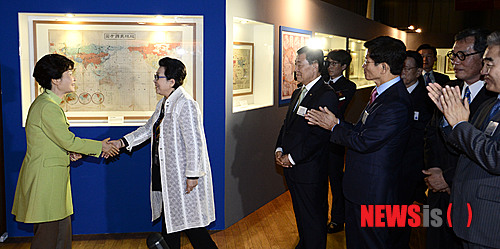 【파주=뉴시스】홍찬선 기자 = 박근혜 대통령이 30일 오후 경기도 파주출판도시에서 열린 파주 북소리 2013을 방문해 고지도에 대해 김혜정 경희대 혜정박물관장의 설명을 들은 후 악수를 하고 있다. 2013.09.30.