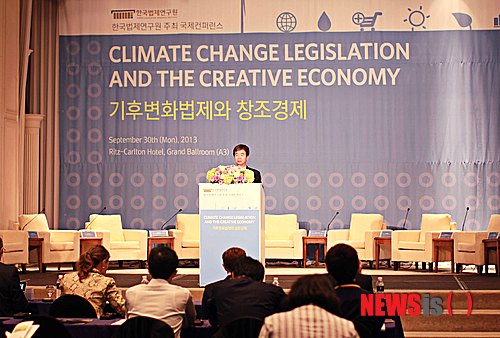 【서울=뉴시스】한국법제연구원(원장 이원)은 30일 서울 강남구 리츠칼튼 호텔 그랜드볼룸에서 '기후변화법제와 창조경제'를 주제로 국제컨퍼런스를 개최했다. 한국법제연구원 이원 원장이 환영사를 하고 있다. 2013.09.30. (사진=한국법제연구원 제공)
