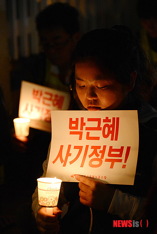 【서울=뉴시스】김진아 인턴기자 = 30일 오후 서울 종로구 세종로 정부서울청사 후문 앞에서 열린 '해고자 원직 복직 촛불집회'에서 전국공무원노조 희생자원상회복투쟁위원회가 피켓을 들고 있다. 2013.09.30.