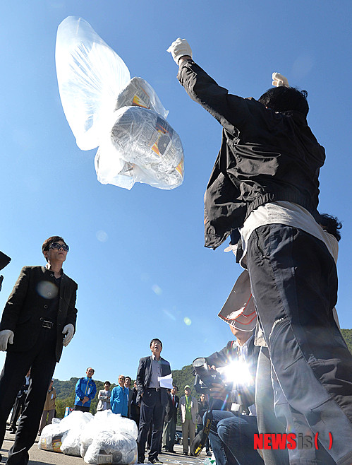 【파주=뉴시스】 박문호 기자 = 2007년 10·4 남북정상회담 6주년인 4일 오전 경기 파주 탄현면 통일동산 주차장에서 자유북한운동연합(대표 박상학) 회원과 실향민들이 이산가족 상봉 행사를 촉구하는 대북전단과 1달러짜리 지폐 1천 장, 북한인권 동영상, 한국의 발전상을 담은 소책자를 대형 풍선에 달아 날리고 있다. 2013.10.04.
