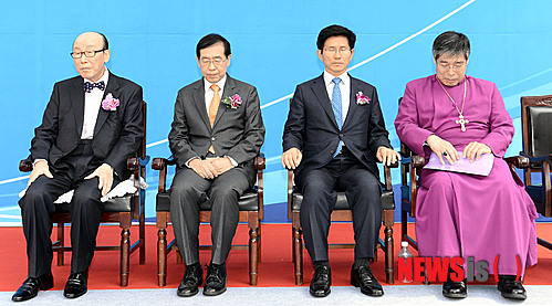 【서울=뉴시스】홍찬선 기자 = 조용기 순복음선교회 총재과 박원순 서울시장, 김문수 경기도지사, 김근상 대한성공회 의장 주교가 11일 오후 서울 상암동 월드컵경기장에서 열린 2013 한반도의 평화와 세계교회의 희망을 위한 기도대성회에 참석해 기도를 하고 있다. 2013.10.11.