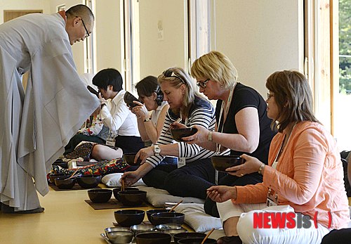 【대구=뉴시스】주기철 기자 =14일 대구 동구 동화사 내 국제선수련관 참선당에서 템플스테이에 참가한 대구세계에너지총회에 한 참석자와 가족들이 혜장 스님으로부터 바루공양을 배우며 체험하고 있다. 2013.10.14.