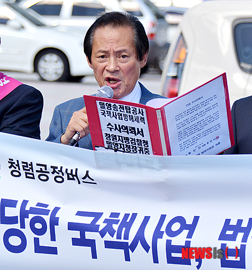 【밀양=뉴시스】안지율 기자 = 국책사업 훼방 선동세력 추방 국민운동본부 활빈단 홍정식 대표가 16일 오후 경남 밀양시청 광장에서 송전탑 공사와 관련해 '불법행위를 일삼는 외부불순세력은 밀양을 떠나라'고 촉구하는 기자회견을 하고 있다. 2013.10.16.