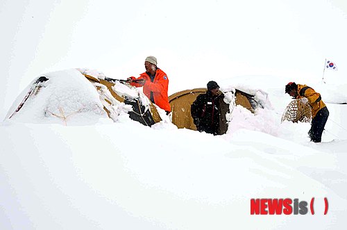 【로체 BC(네팔)=뉴시스】임영주 기자 = 로체원정대원들이 15일 폭설로 베이스캠프에 쌓인 눈과 텐트에 쌓인 눈을 치우고 있다.