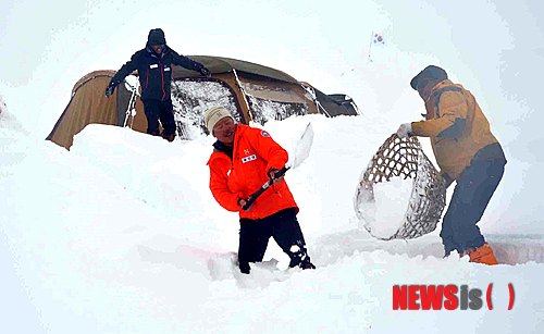 【로체 BC(네팔)=뉴시스】임영주 기자 = 로체원정대원들이 15일 폭설로 베이스캠프에 쌓인 눈과 텐트에 쌓인 눈을 치우고 있다.