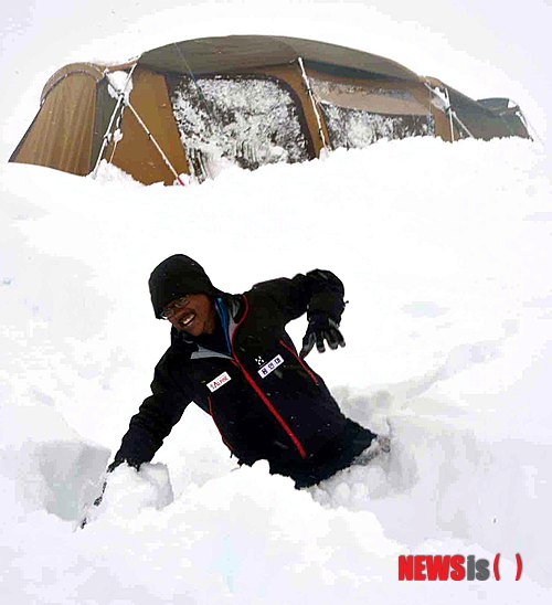 지난 13일(현지시각) 오전부터 15일까지 내린 눈이 허벅지 높이까지 쌓였다. 텐트가 무너질까 봐 눈 속에서 밤새 눈을 쓸어내렸다.