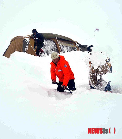 【로체 BC(네팔)=뉴시스】임영주 기자 = 로체원정대원들이 15일 폭설로 베이스캠프에 쌓인 눈과 텐트에 쌓인 눈을 치우고 있다.