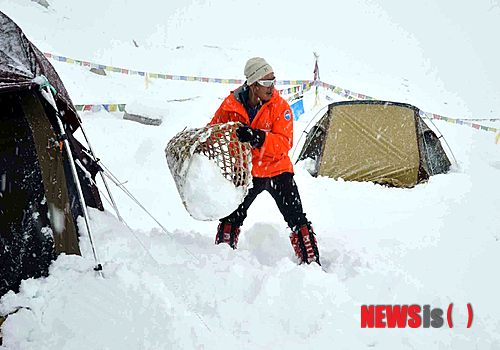 【로체 BC(네팔)=뉴시스】임영주 기자 = 로체원정대원들이 15일 폭설로 베이스캠프에 쌓인 눈과 텐트에 쌓인 눈을 치우고 있다.