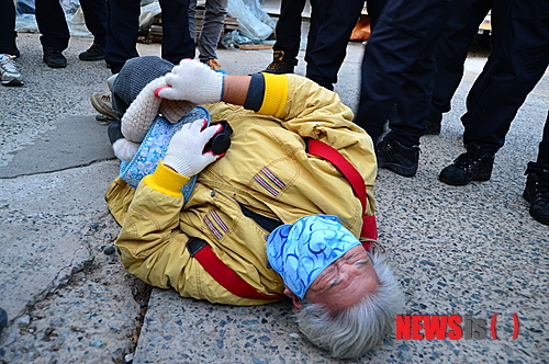 【밀양=뉴시스】강승우 기자 = 17일 오전 경남 밀양시 단장면 바드리마을 입구(84·89번 송전탑 공사 진입로)에서 송전탑 반대 주민 할머니가 도로에 누워 경찰에 항의하고 있다. 2013.10.17.