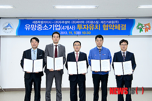 【세종=뉴시스】노왕섭 기자 = 세종시가 ㈜두루셀텍·㈜싸이텍·㈜광스틸·재진가로등㈜ 등 유망 중소기업 4개사와 투자협약을 체결했다. 사진은 좌측부터 오두환 ㈜싸이텍 대표, 이준희 ㈜두루셀텍 대표, 유한식 시장, 곽인학 ㈜광스틸 대표, 이성형 재진가로등㈜ 대표가 5일 시보건소에서 협약서 서명 후 기념촬영을 하고 있다. 2013.11.05. (사진=세종시청 제공)