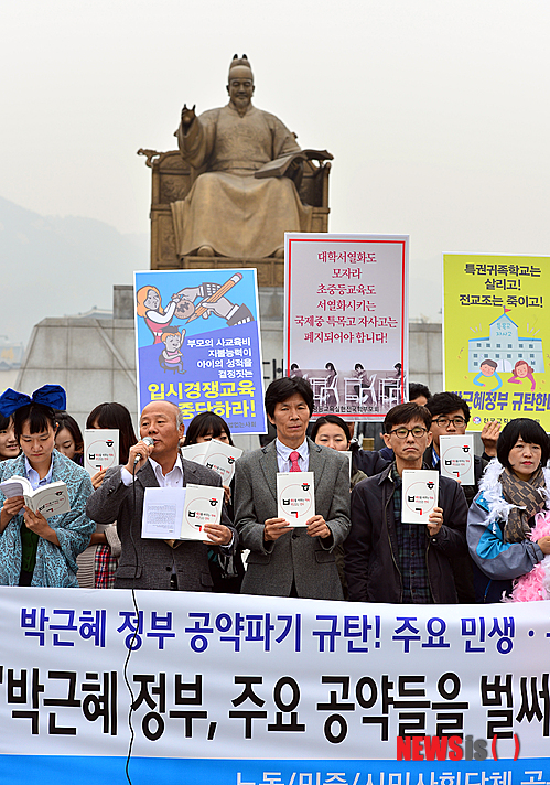 【서울=뉴시스】조종원 기자 = 6일 오전 서울 광화문 광장 세종대왕 동상 앞에서 민주노총과 참여연대를 비롯한 시민단체회원들이 박근혜 정부 공약파기 규탄 공동 퍼포먼스·기자회견을 하고 있다. 2013.11.06.