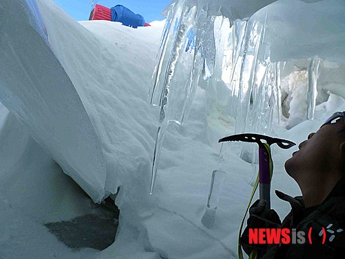 【로체 BC(네팔)=뉴시스】임영주 기자 = 제2차 로체 정상 등반에 나선 로체원정대 홍성택 대장이 5일 오후 벌어진 크레바스속에서 건너갈 궁리를 하고 있다.