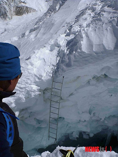【로체 BC(네팔)=뉴시스】임영주 기자 = 제2차 로체 정상 등반에 나선 로체원정대 홍성택 대장이 5일 오후 벌어진 크레바스에 대롱대롱 달린 사다리를 보고 있다.
