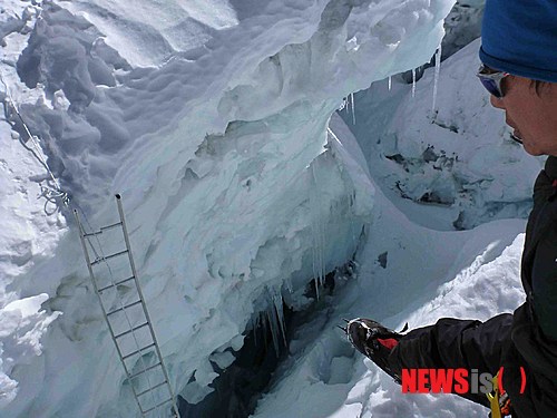 【로체 BC(네팔)=뉴시스】임영주 기자 = 제2차 로체 정상 등반에 나선 로체원정대 홍성택 대장이 5일 오후 벌어진 크레바스에 대롱대롱 달린 사다리를 보고 있다.