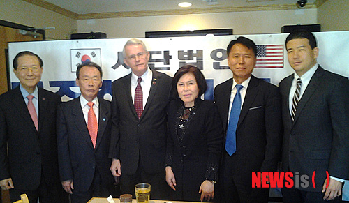 【뉴욕=뉴시스】노창현 특파원 = 미국 버지니아주 상원이 공립학교 교과서에 동해와 일본해 병기를 의무화하는 법안을 상정한다. 17일 미주한인의 목소리(VOKA 회장 피터 김)에 따르면 “민주당에 이어 공화당이 동해 병기 법안을 별도 상정한다고 알려왔다”고 말했다. 이와 관련, 공화당의 리처드 블랙 상원의원이 18일 동해병기 법안 상정계획에 따른 기자회견을 열었다. 사진은 피터 김 회장 등 VOKA 관계자들과 리처드 블랙 상원의원. 2013.11.18. <사진=VOKA 제공>