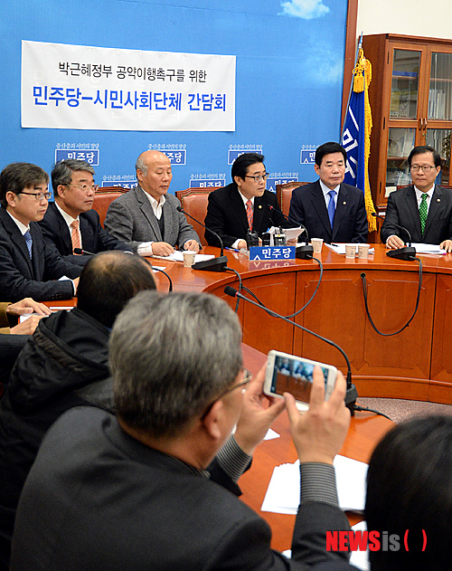 【서울=뉴시스】전진환 기자 = 21일 오전 '박근혜 정부 공약이행촉구 간담회'가 열린 서울 여의도 국회 민주당 원내대표실에서 전병헌 원내대표가 인사말을 하고 있다. 2013.11.21.