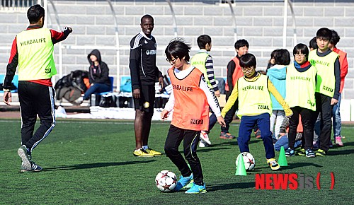 【부산=뉴시스】 하경민 기자 = 23일 오전 부산 영도구 마린축구장에서 한국허벌라이프 주최로 열린 '허벌라이프 영어축구교실'에 참가한 어린이 40여 명이 부산 주재 외국인 아마추어 축구팀의 도움을 받아 축구 기본기를 배우고 있다.