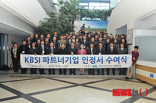 【대전=뉴시스】이시우 기자 = 한국기초과학지원연구원(원장 정광화, 이하 KBSI)은 26일 대덕본원에서 (주)하늘엔지니어링(대표 홍창덕) 등 22개 중소기업 관계자가 참석한 가운데 'KBSI 파트너기업 인정서 수여식'을 열고 선정 중소기업에 대한 협력과 지원을 약속했다. 2013.11.26.(사진=KBSI 제공)