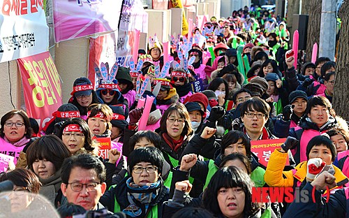 【서울=뉴시스】 고승민 기자 = 전국학교비정규직연대회의 회원들이 29일 오후 서울 종로구 교육부 앞에서 박근혜정부 공약파기 규탄! 호봉제 실시! 고용안정 쟁취! 학교비정규직 노동자파업대회를 열고 구호를 외치고 있다. 2013.11.29.