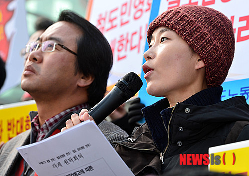 【서울=뉴시스】 박문호 기자 = ‘철도 민영화 반대 각계 원탁회의’를 마친 김재연 통합진보당 의원이 4일 오전 서울 중구 봉래동 서울역사 앞에서 열린 ‘철도파업예고에 따른 기자회견’에서 발언하고 있다.
