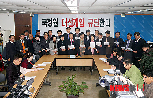 【전주=뉴시스】유영수 기자 = 이명연 전주시의회 의장과 의원들은 5일 전북 전주시청 브리핑룸에서 기자회견을 갖고 "박근혜 정부는 국정원의 대선개입을 사과하라"고 촉구했다.2013.12.05.