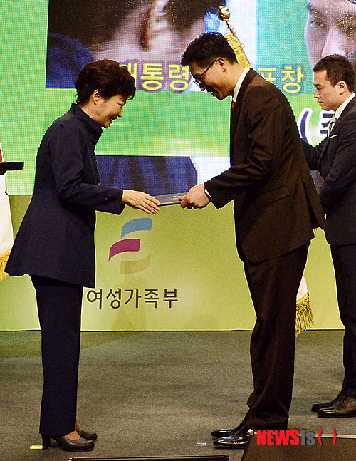 【서울=뉴시스】홍찬선 기자 = 박근혜 대통령이 9일 오후 서울 중구 대한상공회의소에서 열린 여성가족부 주최 2013 일·가정양립실천대회에서 이경일 솔트룩스 대표이사에서 대통령 표창을 수여하고 있다. 2013.12.09.