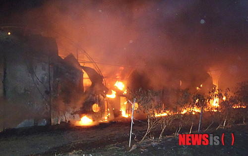 【상주=뉴시스】김진호 기자 = 16일 오후 10시 10분께 경북 상주시 내서면 신촌1리 버섯재배 비닐하우스가 화염속에 불타고 있다.