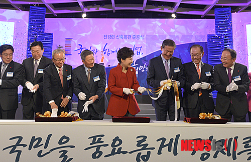 【서울=뉴시스】김영욱 기자 = 박근혜 대통령이 17일 오전 서울 영등포구 전경련회관 컨퍼런스센터에서 열린 '전국경제인연합회 신축회관 준공식'에 참석, 테이프 커팅식 도중 허창수 전국경제인연합회 회장이 테이프를 자르는데 어려움을 겪자 참석자들과 웃으며 응원하고 있다. 2013.12.17.