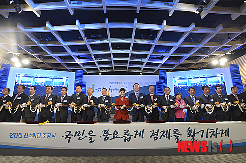 【서울=뉴시스】김영욱 기자 = 박근혜 대통령이 17일 오전 서울 영등포구 전경련회관 컨퍼런스센터에서 열린 '전국경제인연합회 신축회관 준공식'에 참석, 허창수 전국경제인연합회 회장 등 내빈들과 테이프를 자르고 있다. 2013.12.17.