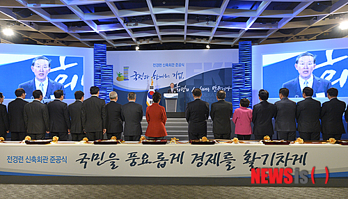 【서울=뉴시스】김영욱 기자 = 허창수 전국경제인연합회 회장이 17일 오전 서울 영등포구 전경련회관 컨퍼런스센터에서 열린 '전국경제인연합회 신축회관 준공식'에 참석, 기념사를 하고 있다. 2013.12.17.