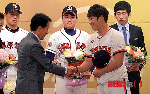 【서울=뉴시스】김인철 기자 = 17일 오후 서울 마포구 가든호텔에서 열린 2013 야구인의 밤에서 동국대 강민국이 우수상을 수상 하고 있다. 2013.12.17.