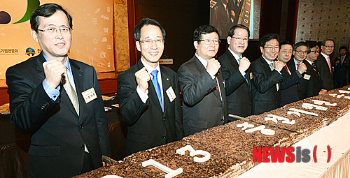 【서울=뉴시스】강진형 기자 = 윤상직(왼쪽 다섯 번째) 산업통상자원부 장관이 18일 오후 서울 중구 소공동 롯데호텔에서 열린 '2013 중견기업인 송년의 밤'에서 강호갑(왼쪽 네 번째) 한국중견기업연합회 회장을 비롯한 주요 내빈들과 2013년을 마무리하는 떡 절단을 한 뒤 사진촬영을 하고 있다. 2013.12.18.