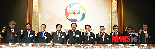【서울=뉴시스】강진형 기자 = 윤상직(오른쪽 다섯 번째) 산업통상자원부 장관이 18일 오후 서울 중구 소공동 롯데호텔에서 열린 '2013 중견기업인 송년의 밤'에서 강호갑(왼쪽 다섯 번째) 한국중견기업연합회 회장을 비롯한 주요 내빈들과 2013년을 마무리하는 떡 절단을 마친 뒤 사진촬영을 하고 있다. 2013.12.18.