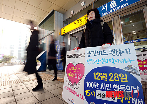 【서울=뉴시스】김진아 기자 = 철도노조파업 18일째인 26일 오전 서울 용산구 동자동 서울역 앞에서 민주노총 공공운수노조·연맹 관계자가 '철도민영화 반대, 12월 28일 서울시청광장 100만 시민 행동의 날'을 알리는 표지판을 들고 있다. 2013.12.26.