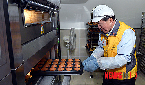 【서울=뉴시스】강진형 기자 = 허창수 전국경제인연합회 회장이 26일 오전 서울 강남구 개포동 남부적십자혈액원에서 열린 '연말 나눔 봉사'에서 지역 독거노인 및 아동센터에 전달 될 빵을 만들고 있다. 2013.12.26.