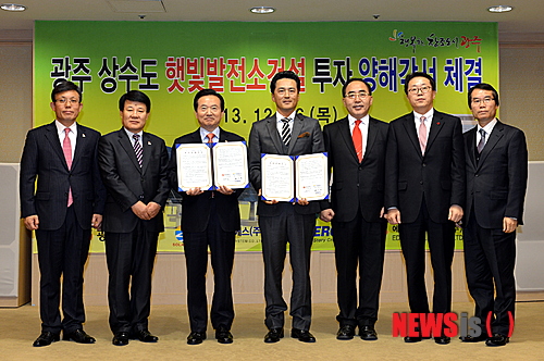 【광주=뉴시스】구길용 기자 = 광주시는 26일 시청 비즈니스룸에서 강운태 광주시장과 한광현 쏠라이앤에스㈜ 대표가 참석한 가운데 '광주 상수도 햋빛발전소 건설'에 관한 투자양해각서를 체결했다. 2013.12.26. (사진=광주시 제공)