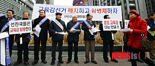 【서울=뉴시스】홍찬선 기자 = 선진사회만들이연대 회원들이 3일 오전 서울 종로구 청계광장 앞에서 '교육감선거 폐지하고 임명제 하자' 캠페인을 벌이고 있다. 2014.01.03.