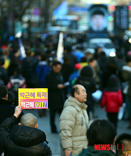 【광주=뉴시스】류형근 기자 = 서울역에서 박근혜 정권 퇴진, 국정원 특검 도입 등을 외치며 분신한 고(故) 이남종(40)씨에 대한 광주 노제가 4일 오후 광주 동구 금남로 옛 전남도청 앞에서 열린 가운데 한 시민이 '박근혜 아웃'이 쓰인 피켓을 들고 있다. 2014.01.04.