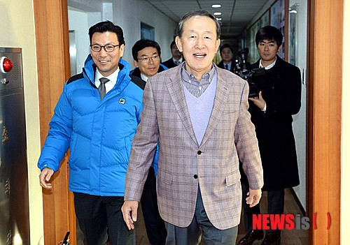 【서울=뉴시스】박영태 기자 = 10일 오전 서울 노원구 태릉선수촌에서 열린 허창수 전국경제인연합회 회장의 소치동계올림픽 선수단 격려식에서 허창수 회장이 태릉선수촌을 방문하고 있다. 왼쪽은 김재열 소치동계올림픽 선수단장. 2014.01.10.