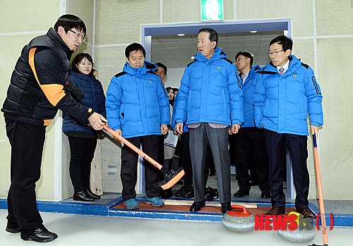 【서울=뉴시스】박영태 기자 = 10일 오전 서울 노원구 태릉선수촌에서 열린 허창수 전국경제인연합회 회장의 소치동계올림픽 선수단 격려식에서 허창수 회장(오른쪽에서 두번째)가 컬링연습장을 방문해 코치의 설명을 듣고 있다. 2014.01.10.