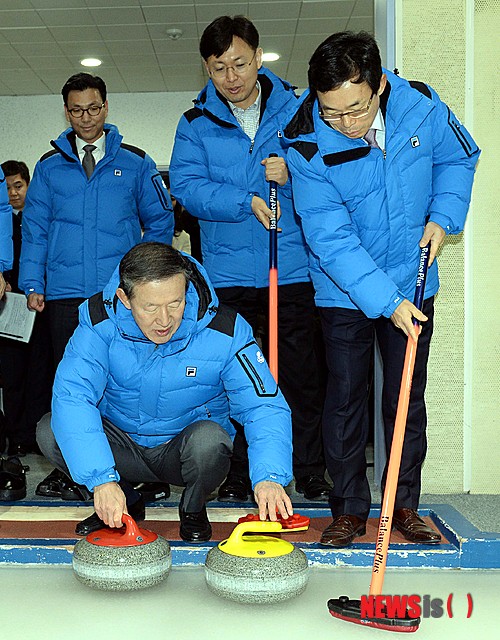 【서울=뉴시스】박영태 기자 = 10일 오전 서울 노원구 태릉선수촌에서 열린 허창수 전국경제인연합회 회장의 소치동계올림픽 선수단 격려식에서 허창수 회장이 컬링 경기장을 방문해 스톤을 직접 만져보고 있다. 오른쪽은 이승철 전경련 상근부회장. 2014.01.10.