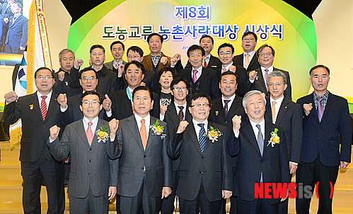 【서울=뉴시스】이종철 기자 = 농협중앙회와 (사)농촌사랑운동본부(상임공동대표. 농협중앙회 최원병 회장, 전국경제인연합회 허창수 회장)가 수상기업 임,직원, 수상마을 대표,주민등 500여명이 참석한 가운데 16일 오후 서울 중구 농협중앙회 대강당에서 개최한 '제8회 도농교류 농촌사랑대상 시상식'이 끝난뒤 이동필 농림축산식품부장관, 최원병 농협중앙회장, 이승철 전국경제인연합회 부회장이 수상자들과 기념사진 촬영을 하며 화이팅을 외치고 있다. 2014. 01 .16
