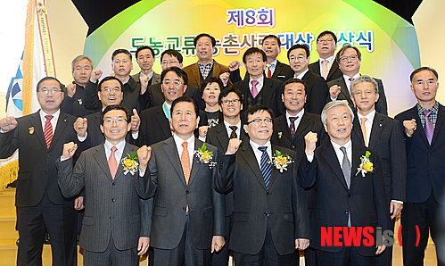 【서울=뉴시스】이종철 기자 = 농협중앙회와 (사)농촌사랑운동본부(상임공동대표. 농협중앙회 최원병 회장, 전국경제인연합회 허창수 회장)가 수상기업 임,직원, 수상마을 대표,주민등 500여명이 참석한 가운데 16일 오후 서울 중구 농협중앙회 대강당에서 개최한 '제8회 도농교류 농촌사랑대상 시상식'이 끝난뒤 이동필 농림축산식품부장관, 최원병 농협중앙회장, 이승철 전국경제인연합회 부회장이 수상자들과 기념사진 촬영을 하며 화이팅을 외치고 있다. 2014. 01 .16