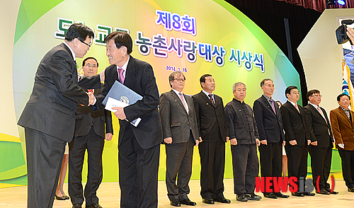 【서울=뉴시스】이종철 기자 = 농협중앙회와 (사)농촌사랑운동본부(상임공동대표. 농협중앙회 최원병 회장, 전국경제인연합회 허창수 회장)가 수상기업 임,직원, 수상마을 대표,주민등 500여명이 참석한 가운데 16일 오후 서울 중구 농협중앙회 대강당에서 개최한 '제8회 도농교류 농촌사랑대상 시상식'에서 이동필 농림축산식품부장관이 시상을 하고 있다. 2014. 01 .16