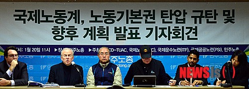 이날 기자회견에는 신승철 민주노총 위원장과 제프 보그트 국제노총(ITUC) 법률자문, 존 에반스 OECD노동조합 자문위원회 사무총장, 데이빗 보이스 국제공공노련(PSI) 사무부총장, 루완 수바싱게 국제운수노련(ITF) 법률자문 등 국제노동계 대표단이 참석했다. 2014.01.20.